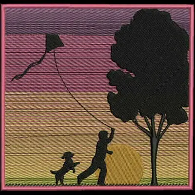 This digital machine embroidery design features a child flying a kite with a dog beside them, framed by a tree and a setting sun. Available for 5X7 hoops.