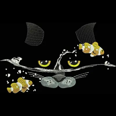 This embroidery design features a cat's face peering above water with two playful fish swimming nearby. Available for 5X7 hoops.