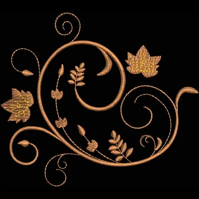 This embroidery design features delicate swirling vines adorned with leaves and floral elements in shades of gold. Available for 4X5 hoops.