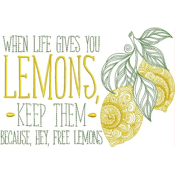 This embroidery design features two bright yellow lemons with decorative leaves and the phrase "When life gives you lemons, keep them because, hey, free lemons."