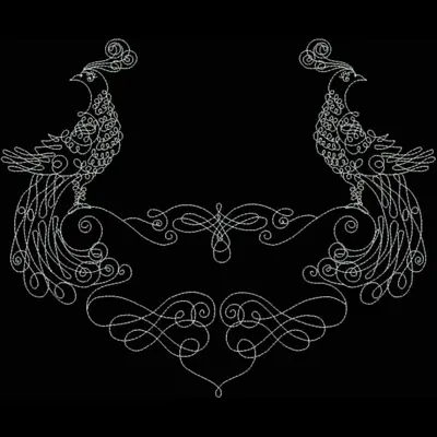 This digital machine embroidery design features two intricately detailed peacocks facing each other, adorned with elegant swirls and decorative motifs. Available in all hoop sizes.