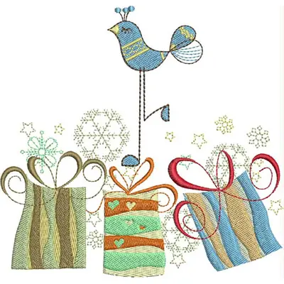 This digital machine embroidery design features a whimsical bird perched above three creatively wrapped gift boxes adorned with bows. Available for 6X6 hoops.