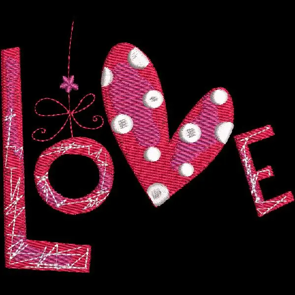 This digital machine embroidery design features the word "LOVE," featuring playful, polka-dotted letters in pink with decorative accents. Available in all hoop sizes.