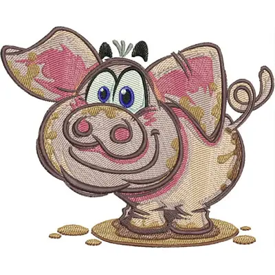 This digital machine embroidery design features a cheerful, cartoon-style pig with exaggerated features, including a big smile and playful eyes, standing in a puddle. Available for 5X7 hoops.