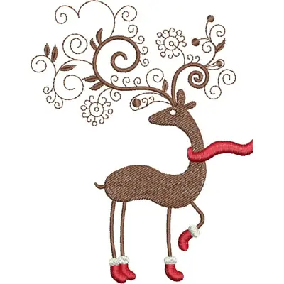 This digital machine embroidery design features a whimsical reindeer adorned with curly antlers, a red scarf, and festive boots. Available for 4X5 hoops.