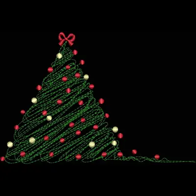 This digital machine embroidery design features a stylized green Christmas tree adorned with red and yellow ornaments and topped with a red bow. Available for 5X7 hoops.