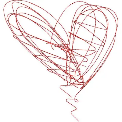 This digital machine embroidery design features a whimsical red heart created with intertwining and looping lines. Available for 5X7 hoops.