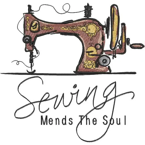 An embroidery design of a vintage sewing machine accompanied by the text “Sewing Mends The Soul.”.