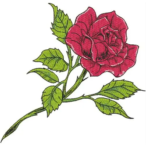 An embroidery design of a vibrant red rose with detailed petals and lush green leaves..