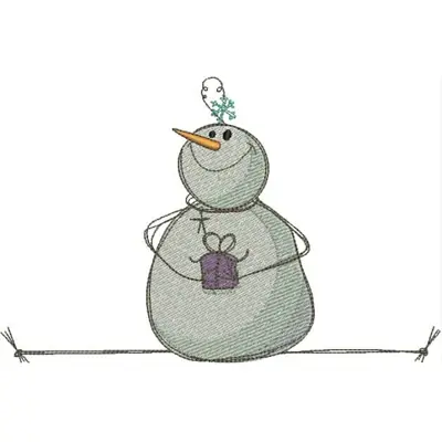 This digital machine embroidery design features a cheerful snowman holding a small purple gift, adorned with a carrot nose and a whimsical hat. Available in all hoop sizes.