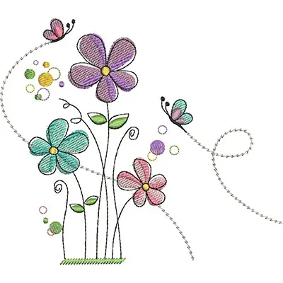 This digital machine embroidery design features colorful flowers with swirling vines and butterflies, showcasing a playful and whimsical motif. Available for 5X7 hoops.