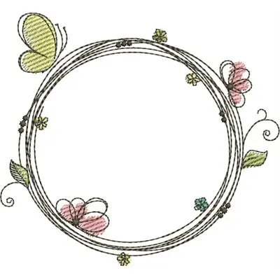 An embroidery design of a decorative circular frame adorned with colorful flowers and butterflies..