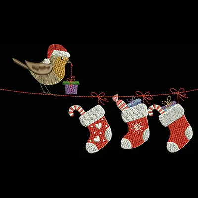 This digital machine embroidery design features a charming bird holding a gift while perched above three festive Christmas stockings adorned with various decorations. Available for 5X7 hoops.
