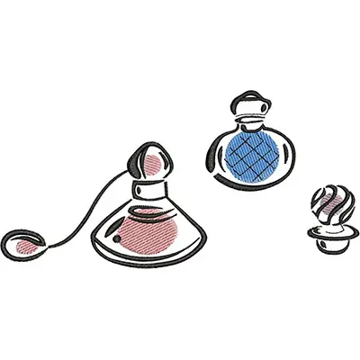 This embroidery design features three stylized perfume bottles, featuring varying shapes and colors. Available for 5X7 hoops.