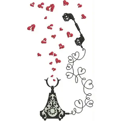 An embroidery design of a vintage telephone with a curled cord and floating red hearts..