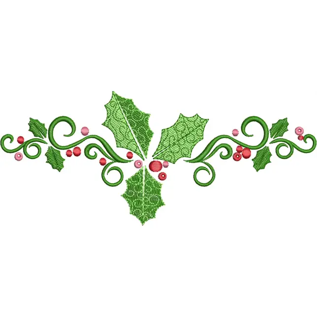 This digital machine embroidery design features holly leaves and berries intertwined with decorative swirls in shades of green and red. Available for 5X7 hoops.
