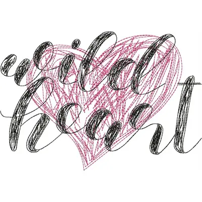 This digital machine embroidery design features a stylized heart with the words "wild heart" in a cursive and textured font. Available in all hoop sizes.