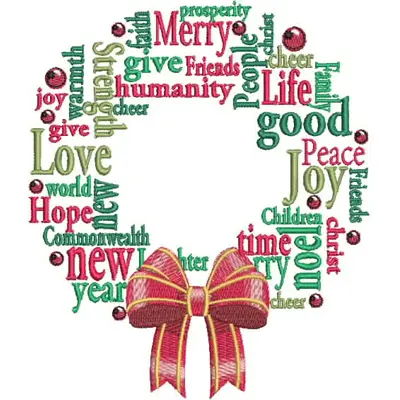 This digital machine embroidery design features a festive wreath composed of colorful words and phrases related to joy, peace, and celebration, accented with a red and green bow. Available in all hoop sizes.