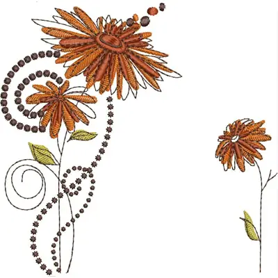 This digital machine embroidery design features vibrant orange flowers adorned with swirling vines and leaves, showcasing intricate detailing and a playful arrangement. Available for 5X5 hoops.