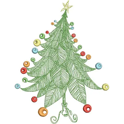 This digital machine embroidery design features a stylized Christmas tree adorned with colorful ornaments and topped with a star. Available for 6X6 hoops.