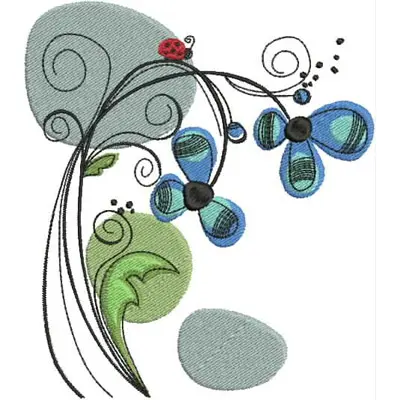 This embroidery design features stylized blue flowers intertwined with whimsical green leaves and delicate swirls, accented by a small ladybug.