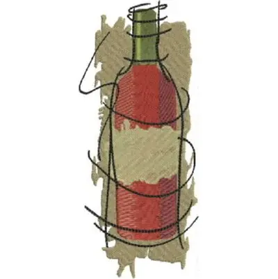 This digital machine embroidery design features a wine bottle with a colorful label, elegantly intertwined with thread elements. Available for 5X7 hoops.