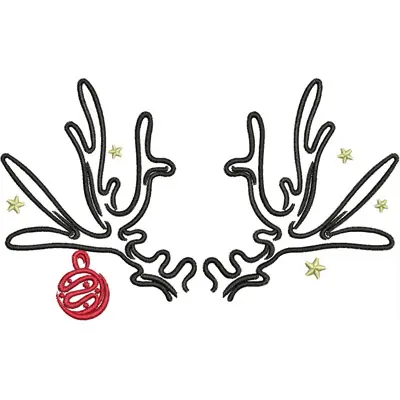This digital machine embroidery design features decorative reindeer antlers featuring a red ornament and small stars. Available for 5X7 hoops.