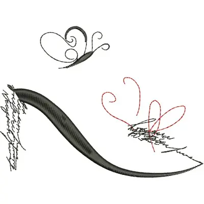 This embroidery design features whimsical butterflies and elegant swirls with scripted elements in black and red hues. Available for 4X5 hoops.