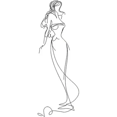 This embroidery design features an elegant woman in a flowing gown, captured in a minimalist, continuous line style. Available in all hoop sizes.