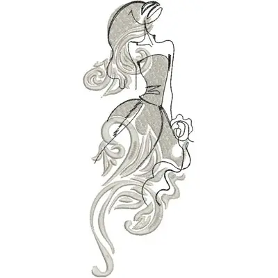 This digital machine embroidery design features a graceful woman in a flowing dress, accented with elegant swirls and a floral element. Available in all hoop sizes.