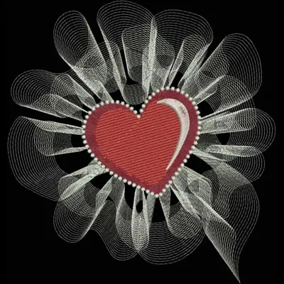 This digital machine embroidery design features a bold red heart surrounded by delicate white swirling motifs and pearl-like accents. Available in all hoop sizes.
