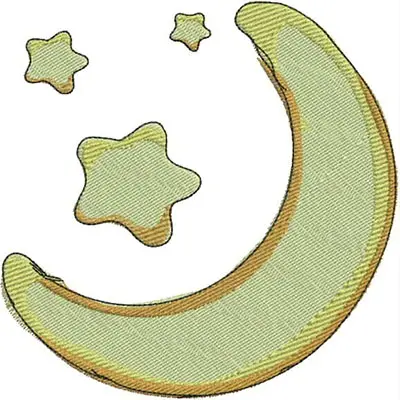 This digital machine embroidery design features a crescent moon accompanied by two stars, featuring soft green and light brown colors. Available in all hoop sizes.
