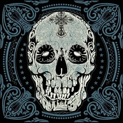 This digital machine embroidery design features a decorative skull featuring floral elements and intricate detailing. Available in all hoop sizes.