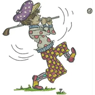 This digital machine embroidery design features a whimsical golfer in a polka-dotted shirt and checkered pants, swinging a club with a playful stance. Available for 5X5 hoops.