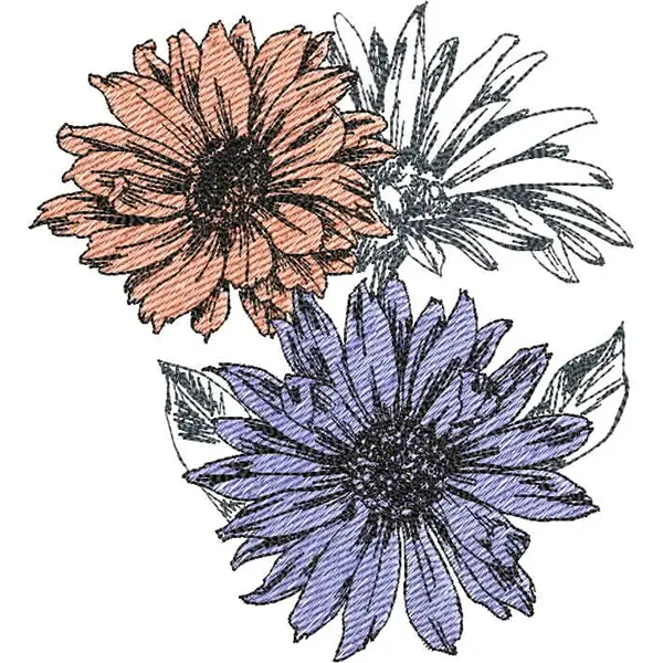 This digital machine embroidery design features three colorful flowers, featuring one orange and two purple blooms with intricate detailing.