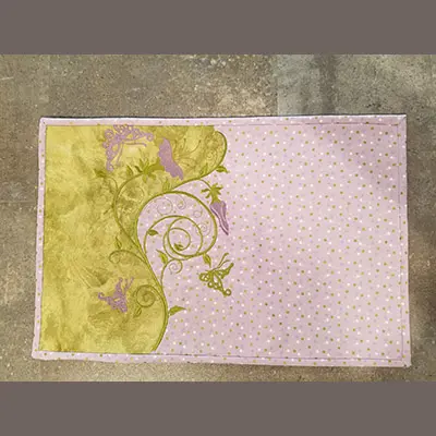 An embroidery design of delicate vine patterns adorned with flowers and butterflies in shades of green and purple on a soft pink background with polka dots..