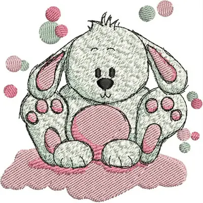 This digital machine embroidery design features a cute, fluffy bunny sitting with its paws outstretched, featuring pink accents and a joyful expression. Available for 4X4 hoops.