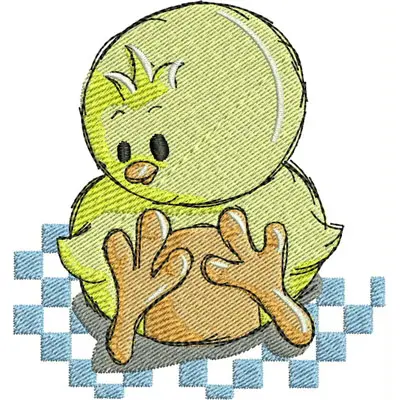 This digital machine embroidery design features a cute yellow chick with a round body and small wings, sitting on its bottom. Available for 4X4 hoops.
