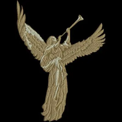 This digital machine embroidery design features an angel with outstretched wings playing a trumpet. Available in all hoop sizes.