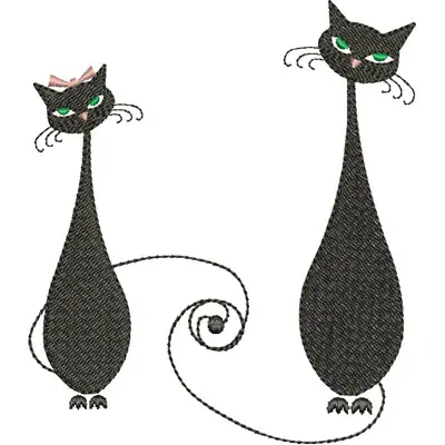This digital machine embroidery design features two stylized black cats, one adorned with a pink bow, featuring elongated bodies and expressive eyes. Available for 5X7 hoops.