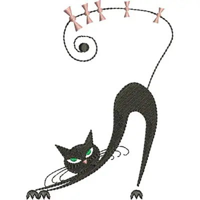 This digital machine embroidery design features a playful black cat stretching with bright green eyes and a whimsical tail adorned with pink bows. Available for 5X5 hoops.