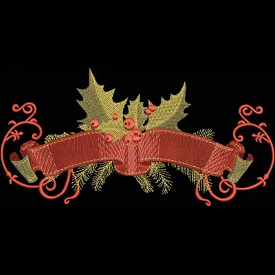This embroidery design features a festive red ribbon adorned with holly leaves and berries, embellished by decorative swirls. Available in all hoop sizes.