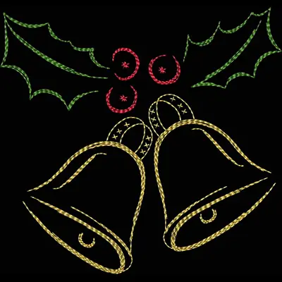 This digital machine embroidery design features two golden bells surrounded by festive holly leaves and red berries. Available in all hoop sizes.