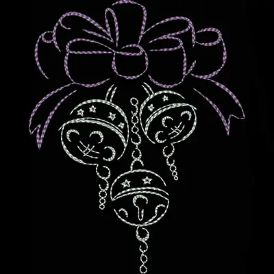 This digital machine embroidery design features three decorative bells adorned with a bow and hanging embellishments. Available in all hoop sizes.
