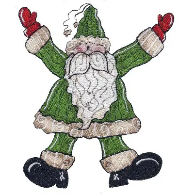 This digital machine embroidery design features a joyful Santa Claus dressed in a green outfit with red gloves and a fluffy white beard, celebrating with his arms raised. Available for 5X7 hoops.