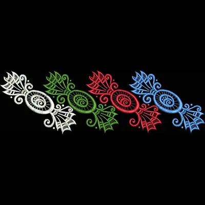 This embroidery design features decorative candy motifs in white, green, red, and blue, featuring swirling patterns and leaf accents. Available in all hoop sizes.