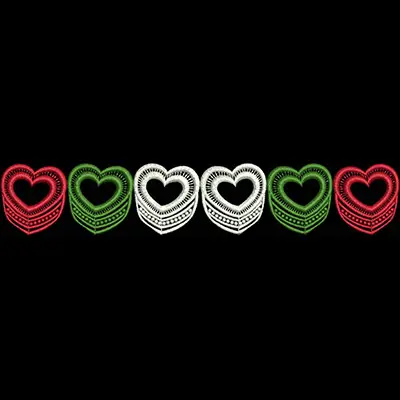 Digital machine embroidery design "CCM Heart Border" in the artist - white dove theme for 5x7, 6x8 and all hoops an embroidery design of alternating layered hearts in red, white, and green. from Kreations by Kara.