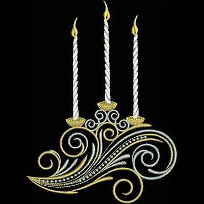 This digital machine embroidery design features three intricately crafted candles surrounded by elegant swirls and flourishes. Available in all hoop sizes.