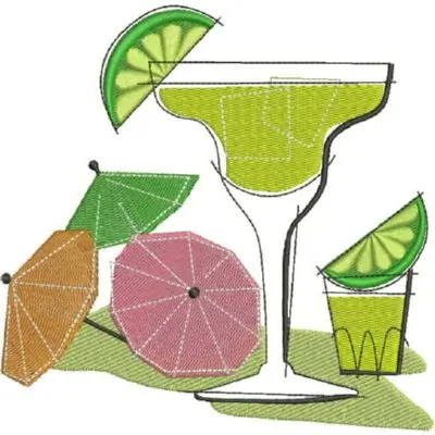 This digital machine embroidery design features a margarita glass accompanied by colorful umbrellas and lime slices. Available in all hoop sizes.