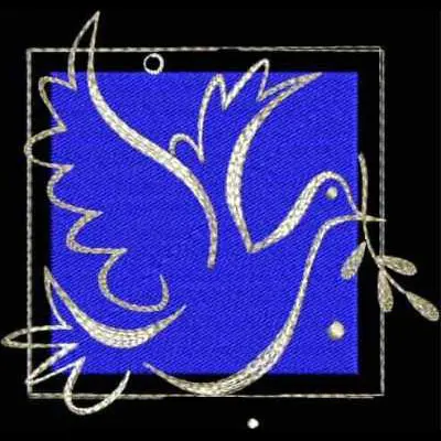 This digital machine embroidery design features a graceful dove carrying an olive branch, outlined in silver thread against a vibrant blue background. Available for 5X7 hoops.